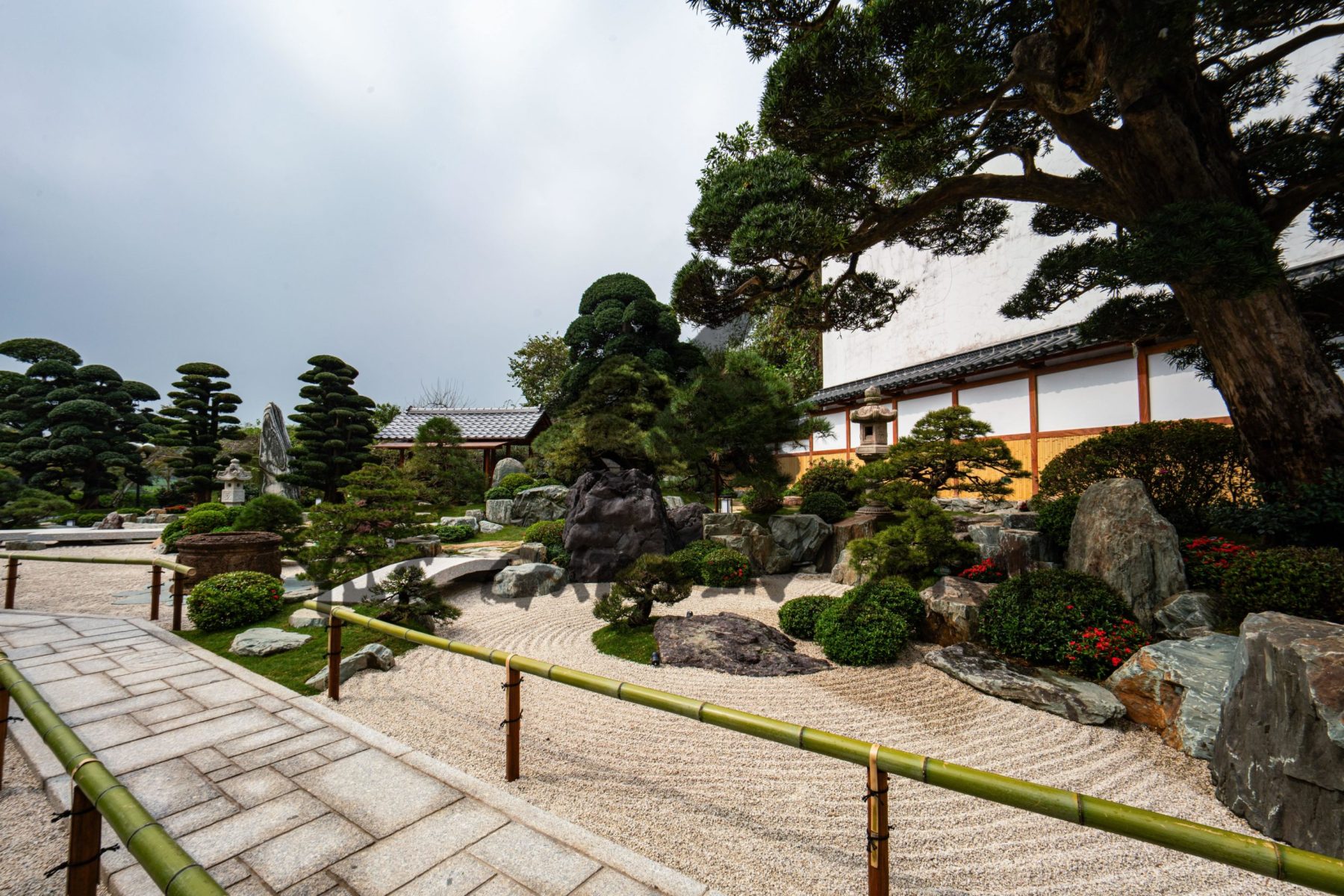 このお客様は日本を何度も訪れ、多くの日本庭園を鑑賞されています。特に、京都にある二条城の庭と足立美術館の庭がお気に入りです。そこで、二条城の庭にある七つの銘石に倣い、ベトナムで縁起が良いとされる数字の九にちなんで、九つの銘石を日本から輸入し九石庭園を造りました。