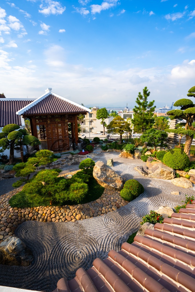 庭の主要な特徴は、ゴツゴツとした大きな石で作られた洲浜です。これらの石は龍の鱗を表し、上から見ると洲浜全体が龍の爪のように見えます。洲浜の周りには、ハロン湾を模し、海をイメージした枯山水。砂紋を描くことで海の雰囲気を強調しました。