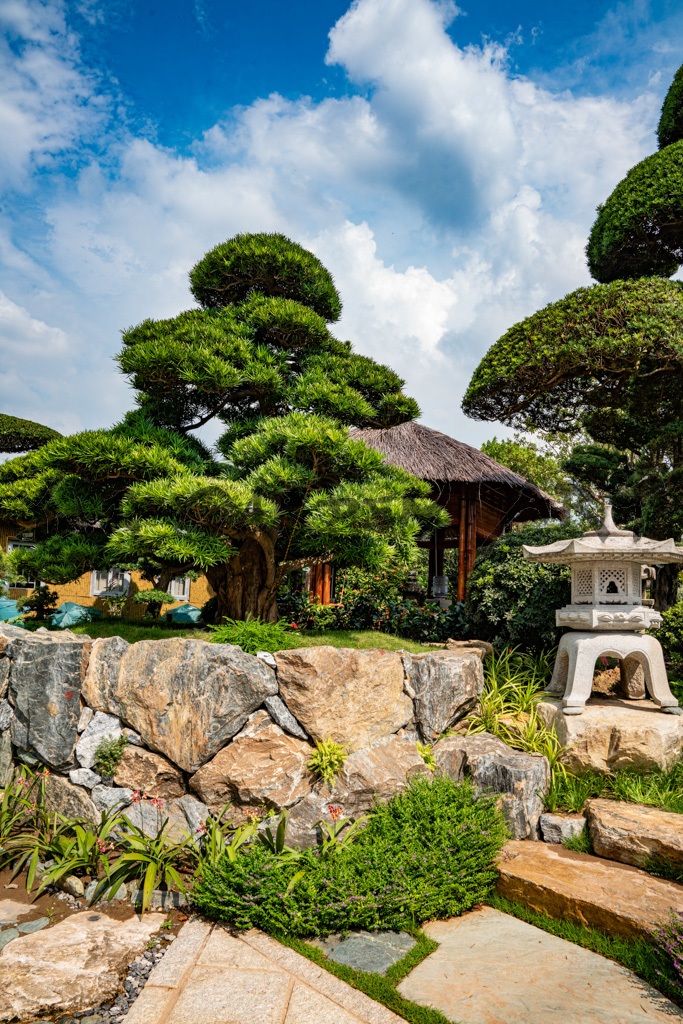 蓬莱山は、古代中国の伝説において不老不死の仙人が住むとされる神秘的な山であり、古くから日本庭園で用いられてきた蓬莱式庭園という伝統的な手法です。この山を模した景石は、庭園に深みと歴史的な風水的な意味合いを加えています。さらに、日本の精緻な庭園デザインと技術を駆使し、自然の美しさと調和を追求しました。