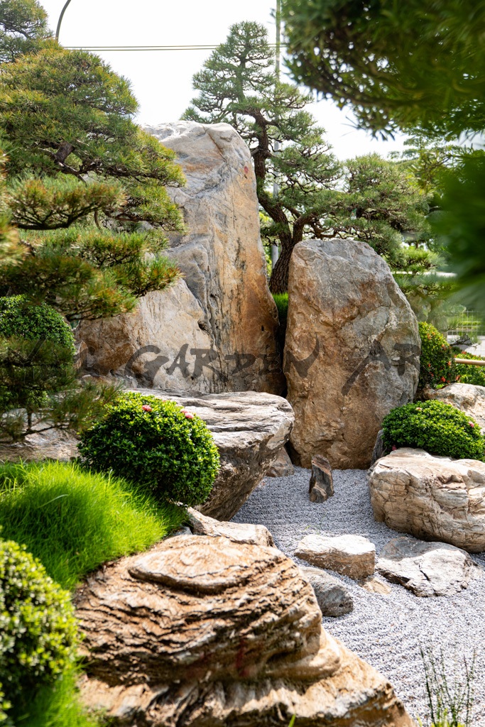 このお客様は日本から輸入した松や槇の木を販売する植木屋さんで、その敷地内に日本庭園を設計しました。この庭園は、商品である松や槇の木の魅力を最大限に引き出すことを目的としています。日本でもなかなかお目にかかれない立派な木々に負けないよう、約20トンの景石を蓬莱山に見立てて配置しました。